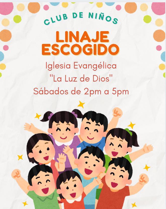 El Club de Niños "Linaje Escogido" es un lugar especial donde los más pequeños aprenden sobre Dios a través de historias, juegos y actividades divertidas. Nos reunimos todos los sábados a las 14:00 para compartir en un ambiente de amor y enseñanza cristiana.